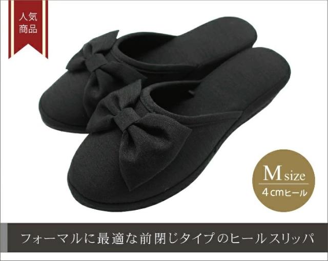 4cm ヒールスリッパ 前閉じタイプ フォーマル シャンタン リボンスリッパ スリッパ リボン ヒール 学校行事 入学式 卒業式 保護者 学校 授業参観 行事 お受験 レディース 女性 かわいい 可愛い おしゃれ 室内 オフィス 黒 ルームシューズ 携帯 携帯用