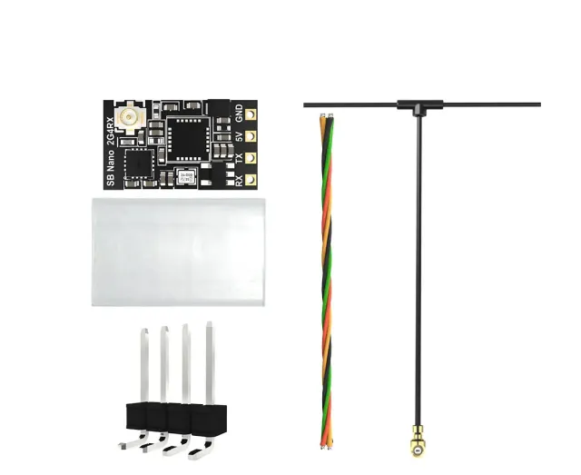 SpecificationsModelSpeedyBee Nano 2.4GHz RXNameExpressLRS ReceiverFrequency2.4GhzAntennaT-antenna (54*78mm, 0.6g)ChipSX1280+ESP8285Power100mWInput voltage5VAntenna connectorIPEX1Weight0.7 gram(without antenna)Dimension10.4mm*18.4mmDefault FirmwareSpeedyBee Nano 2.4GHz RX 3.3.1Light indicatorDouble red blinkingbindingSlow red blinkingpowering up but unlinked, no packages received from the transmitterSolid redreceiver is connected, with signal receivedFast red flashingWi-Fi is turned on, and updating via Wi-Fi is availablePS.To turn on Wi-Fi, wait for 60 seconds after powering on or long press button for 3 secondsQuick to cut off the power 3 times, it enters the binding mode