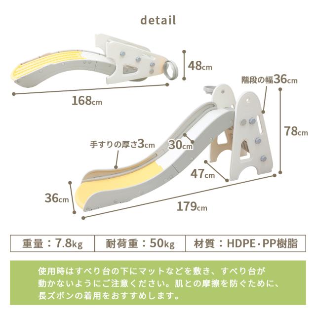 ・必ず保護者のもとでご使用し、お子様の行動には十分ご注意ください。 ・使用時は、すべり台の下にマットなどを敷き、すべり台が動かないようにご注意ください。 ・肌との摩擦を防ぐために、長ズボンの着用をおすすめします。 ・組み立て後は定期的にナットの緩みがないか確認してください。 ・平らな場所でご使用ください。 ・商品は、ご使用の前に一度タオル等で拭いてから遊ぶようにしてください。 ・屋外でのご使用には一切責任を負いかねます。予めご了承ください。 ・耐荷重以上の重量を製品にかけると破損や事故の原因になります。 ・大変危険ですので、2人以上で同時に使用しないでください。 ・火気の近くでのご使用はお止めください。変形や破損、やけどのおそれがあります。 ・折りたたむ際は、指を挟まないようにお気を付けください。 ・ご使用前に取扱説明書や使用上の注意を必ずお読みください。 ・ラッピングは承っておりません。 ・海外製品のため梱包や輸送による本体の細かな傷や擦れ・汚れがある場合がございますのでご理解、ご了承ください。 ・商品は、モニターによって色合いが異なって見える場合があります。 ・仕様・デザインは改良のため予告なく変更することがあります。 |
