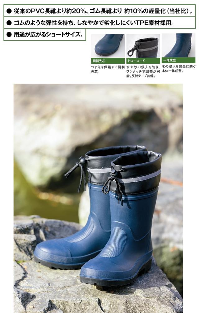 ◎商品説明:従来のゴム長靴より約10%の軽量化(同社比)に成功!従来のPVC長靴と比べると約20%もの軽量化に成功しています(同社比)。ゴムのような弾性を持ち、しなやかで劣化しにくいTPE素材を採用しています。ショートサイズなので用途が広がり便利です!