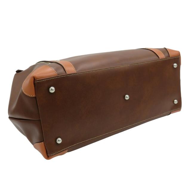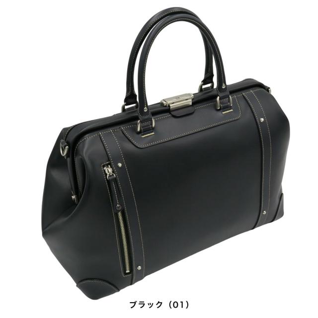 内部は仕切りの無い大きな空間で荷物が詰めやすくなっています。前面にファスナーポケットが1つ取り付けられていますので、細かなものを収納するスペースとして便利です。本体底面には金属製で大きめの底鋲が5つ取り付けられていて、置き場所も気になりません。ハンドル部分・ファスナー引き手は本革製です。使うほどに手になじんできます。本革を使用した肩あて付きショルダーベルトも付属しておりますので、肩から掛けて使っていただく事もできます。2泊程度の荷物なら楽勝で収納できます。鞄生産日本一の街、兵庫県豊岡市で職人が一点づつ仕上げている鞄です。社団法人日本かばん協会会員企業が日本で生産したもののみに認定される「信頼のマーク」がついています。