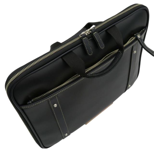 本体はパトリックと言うボリュームのあるPVC(ポリ塩化ビニル)を使用し、重厚感漂う雰囲気に仕上げています。PVC素材なので雨や汚れに強くお手入れも簡単です。ハンドル部分やファスナーの引手などは本革製で使うほどになじんできます。本体内部はケーブル・小物類など挟み込んで仕分けがしやすく収納できるようにゴムバンドを2列設置。メッシュ素材のファスナーポケットは収納したものが一目でわかるのが特長です。単独でクラッチバッグとして使用するも良し。ビジネスリュックと一緒に使う際はパソコン・パッド入れとして活用するも良しです。シーンによって使い分けていただく事が可能です。14インチサイズノートPC対応。1000年の伝統を誇る鞄生産日本一の兵庫県豊岡の工房で熟練の職人が一品づつ丁寧な仕事で手作りしています。