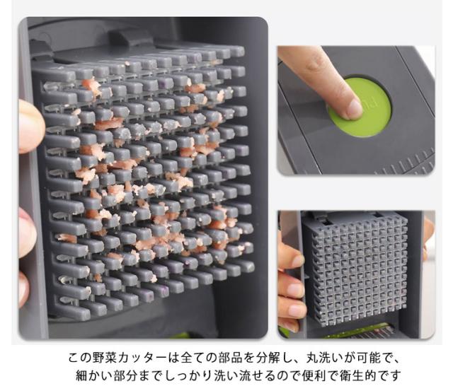 | 下ごしらえの時間を大幅短縮する多機能キッチンスライサーセットです。 プレートを取り替えるだけで、おろし、千切り、つま切り、スライス、角切り、短冊切り、ワッフルスライスなど、8通りのプレートをご用意。 この野菜カッターは全ての部品を分解し、丸洗いが可能で、細かい部分までしっかり洗い流せるので便利で衛生的です、 底部には水切りバスケットがあるので、切った野菜をバスケットに浸して、掃除の仕上げにつまむことができます。 安全ホルダーで小さくなった野菜を掴めることで、手を切る心配まったくないで、安全にスライスできます。 スライサーに鋭い切れ味のステンレス刃物を備えており、気軽に食材をスライスできます | |