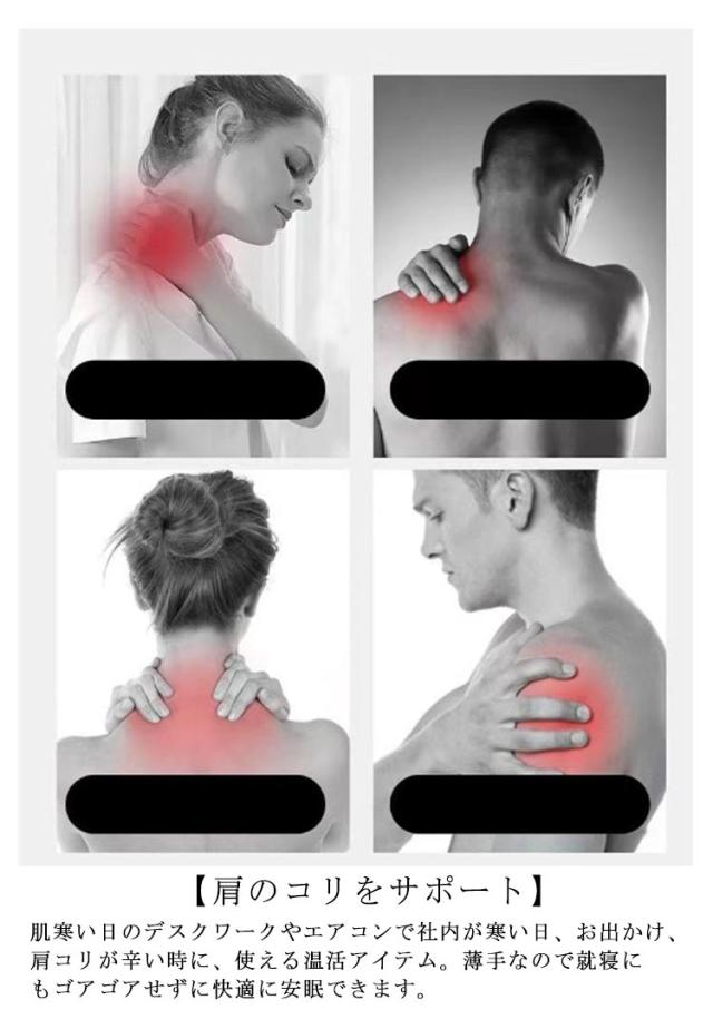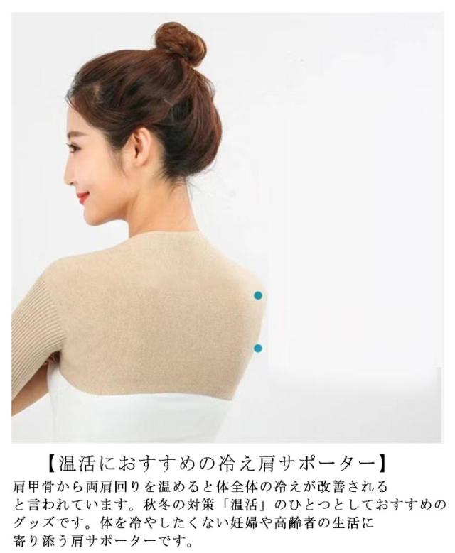 | 就寝時の冷房対策や真冬の冷え対策に!肩こりや四十肩、五十肩で肩の不調を抱える方におすすめの肩サポーターです。両肩をやさしく温めることによって、冷えからくる肩のお悩みを解消してくれます。 【温活におすすめの冷え肩サポーター】肩甲骨から両肩回りを温めると体全体の冷えが改善されると言われています。秋冬の対策「温活」のひとつとしておすすめのグッズです。体を冷やしたくない妊婦や高齢者の生活に寄り添う肩サポーターです。 【肩のコリをサポート】 肌寒い日のデスクワークやエアコンで社内が寒い日、お出かけ、肩コリが辛い時に、使える温活アイテム。薄手なので就寝にもゴアゴアせずに快適に安眠できます。 【冷房対策に大活躍】 肩を温めることで、寒気が和らぎ、睡眠の質を上げる効果があります。一枚羽織っていると布団が落ちたときなど寒さに気が付きにくく、朝までぐっすり快眠が得られます。 【薄手軽量・やわらか素材】薄手で軽量のため違和感なく装着していただけます。ごわつかないためお洋服のシルエットを崩すこともありません。肌着の上から着て頂いて、その上からトップスやニットを着てもOK!伸縮素材なので、気になる二の腕対策にもピッタリ。 【心地よいフィット感】長時間の着用でも疲れない適度なフィット感と通気性があります。アームカバーのように羽織るだけで簡単に装着可能で、締め付け感がありません。洗濯などお手入れもしやすく、長くご愛用いただけます。 | |