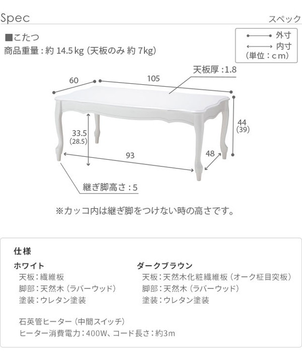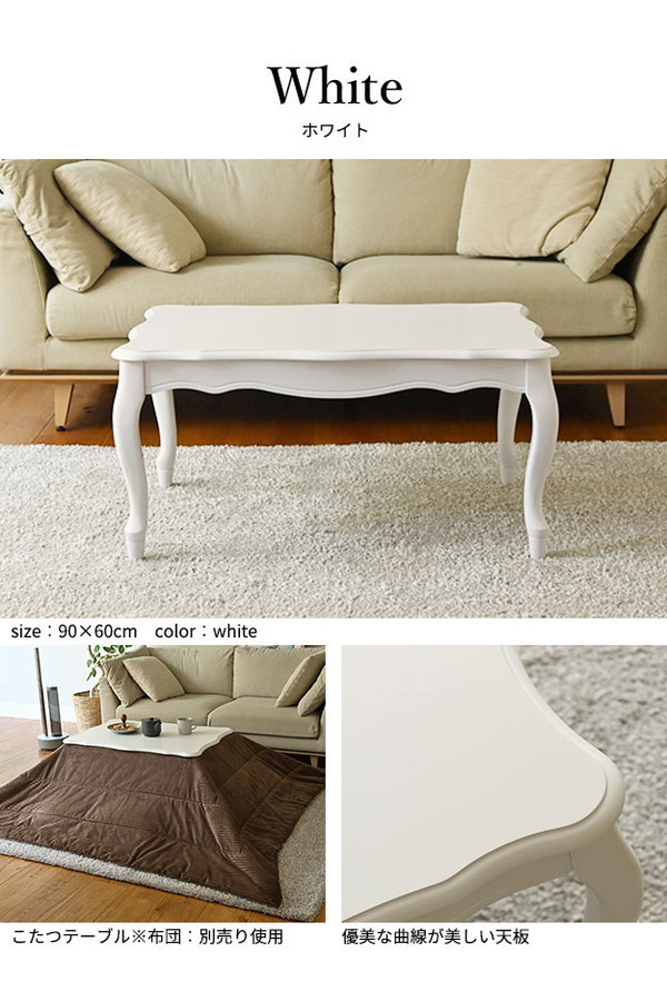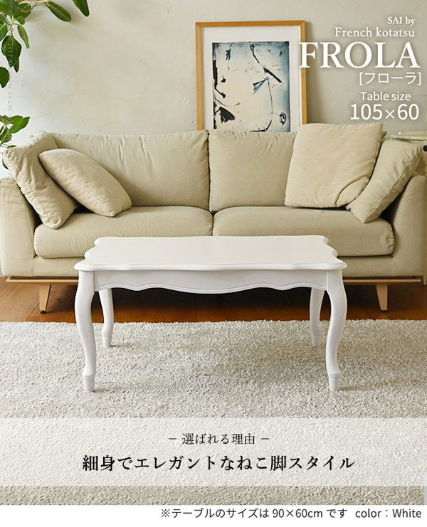 ねこ脚こたつテーブル フローラ 105×60cm SAI 彩 長方形 こたつ単品 継ぎ脚 高さ調節 ローテーブル おしゃれ エレガント 姫系 フレンチカントリー クラシック クラシカル かわいい 白 ホワイト(代引不可)【送料無料】