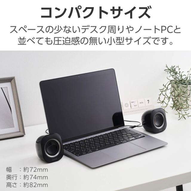省スペースに置ける、パソコン用の小型スピーカーです。AC電源からの給電とφ3.5ミニプラグからの音声入力により、実用最大出力6.0Wのステレオサウンドを手軽に楽しめます。