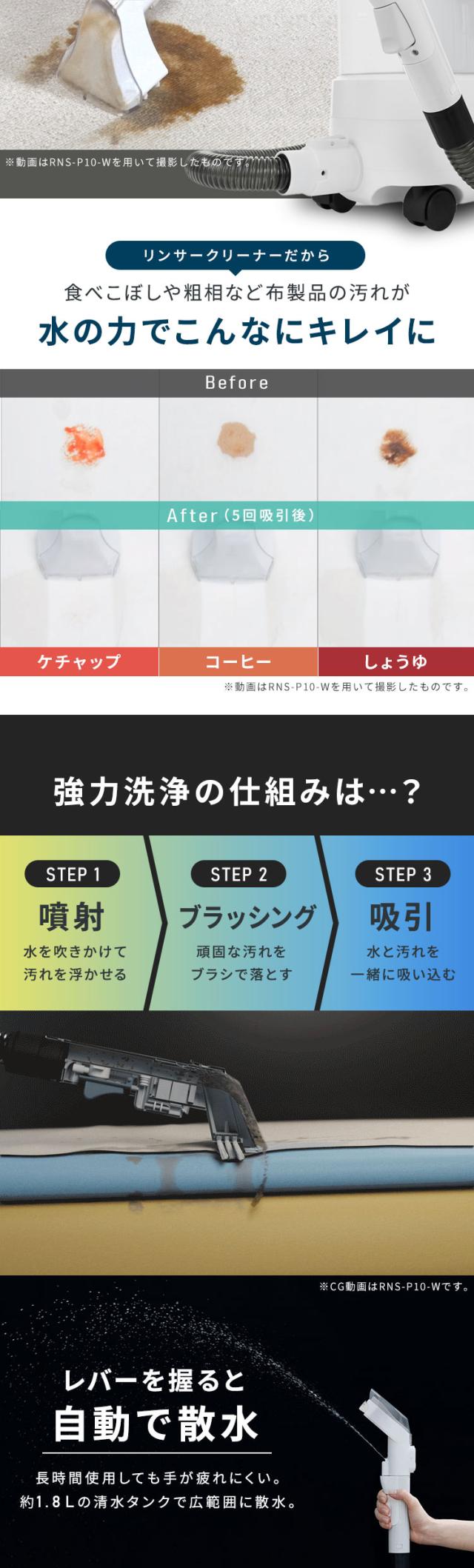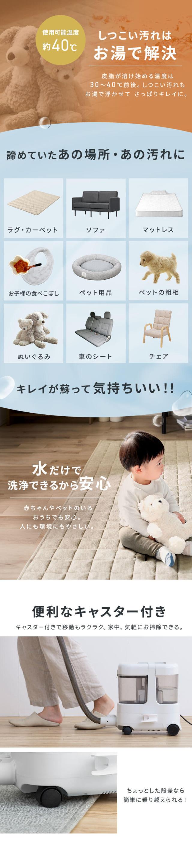 ◆リンサークリーナーだから食べこぼしや粗相など布製品の汚れが水の力できれいに落ちる。