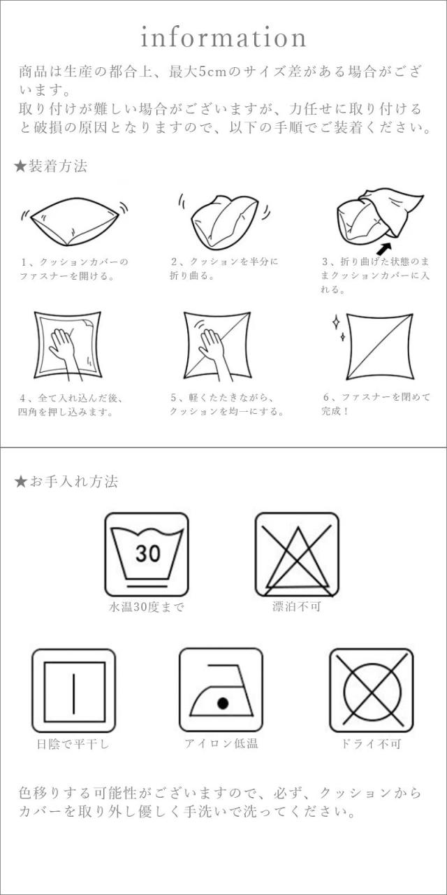 | 注意 事項 | ※カバーのみの販売となり、クッション本体の付属はありません。 ※裏面は無地となります。 ※生産ロッドの違いにより細部のデザインが多少異なる場合がございます。予めご了承くださいませ。 ※画像はイメージです。実物と多少異なる場合がございます。予めご了承くださいませ。 ※製品の特性上、糸のほつれやキズ、汚れなどが発生する場合がございます。使用に支障がない程度は許容範囲とさせていただきます。ご了承の上、ご購入くださいませ。 ※ご使用のモニター環境によって多少色合いが異なる場合がございます。 |