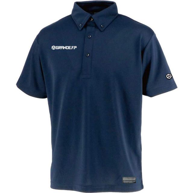GRANDE.F.P定番の.吸汗速乾性に優れたドライメッシュ素材を使用し、前後、シンプルなロゴでまとめ、袖にフットボールをイメージした刺繍がさりげなく施されたシンプルで、シャープなデザインのボタンダウンポロシャツ。