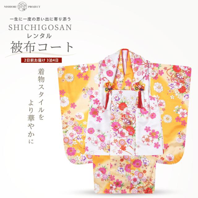 七五三 レンタル 女の子 3歳 被布コート 着物 フルセット 753着物 着物レンタル 貸衣装 七五三 三歳 和装 黄色 イエロー 白 古典 金彩 No.326