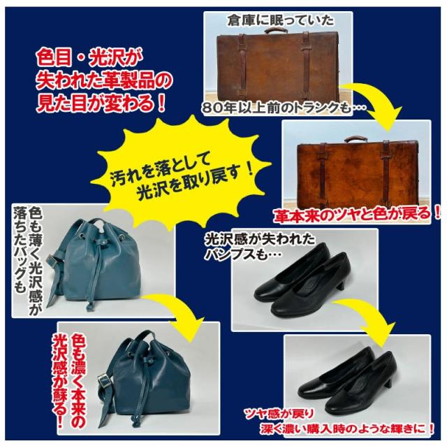 ●革の種類によって色落ち・シミになる場合がありますので、必ず目立たない部分でテストしてから使用する。