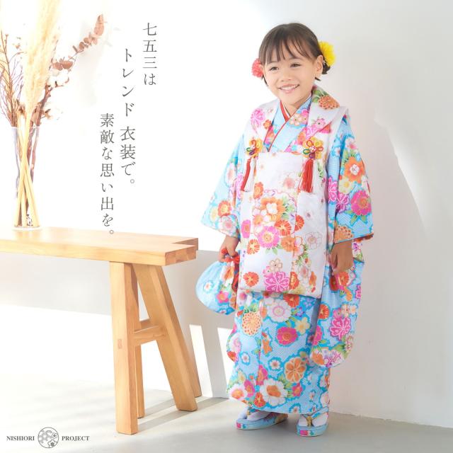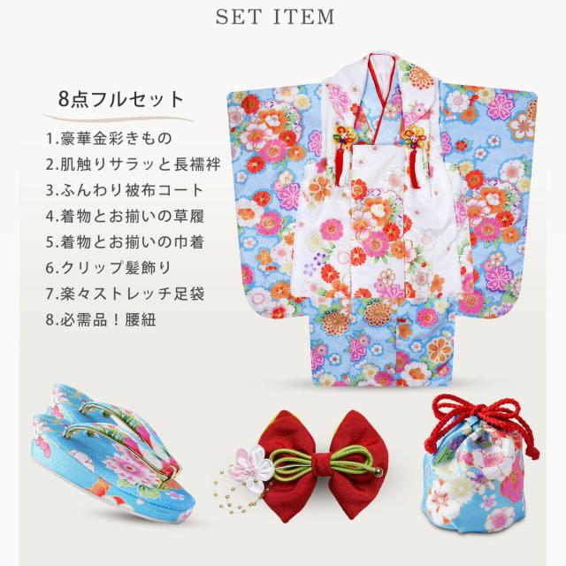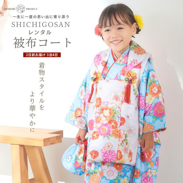 七五三 レンタル 女の子 3歳 被布コート 着物 フルセット 753着物 着物レンタル 貸衣装 七五三 三歳 和装 青 ブルー 白 古典 金彩 No.321
