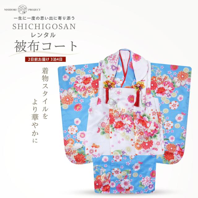 七五三 レンタル 女の子 3歳 被布コート 着物 フルセット 753着物 着物レンタル 貸衣装 七五三 三歳 和装 青 ブルー 白 古典 金彩 No.320
