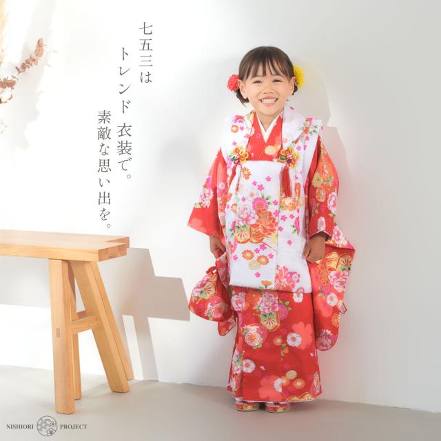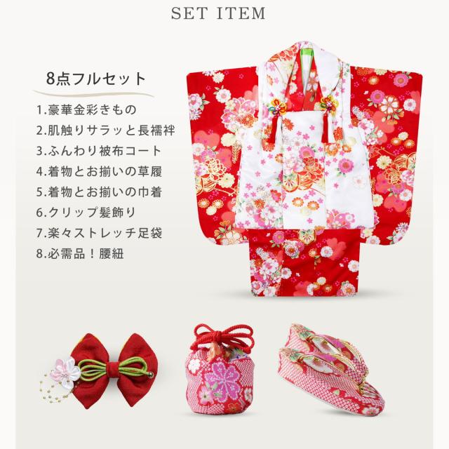 七五三 レンタル 女の子 3歳 被布コート 着物 フルセット 753着物 着物レンタル 貸衣装 七五三 三歳 和装 赤 白 古典 金彩 No.315