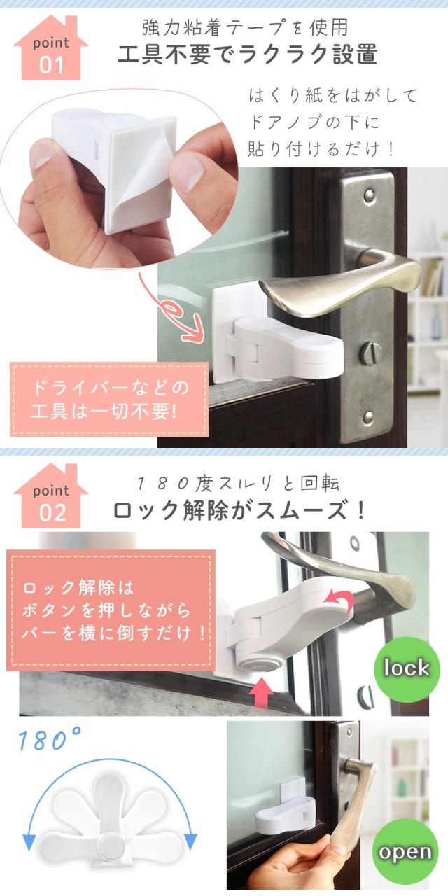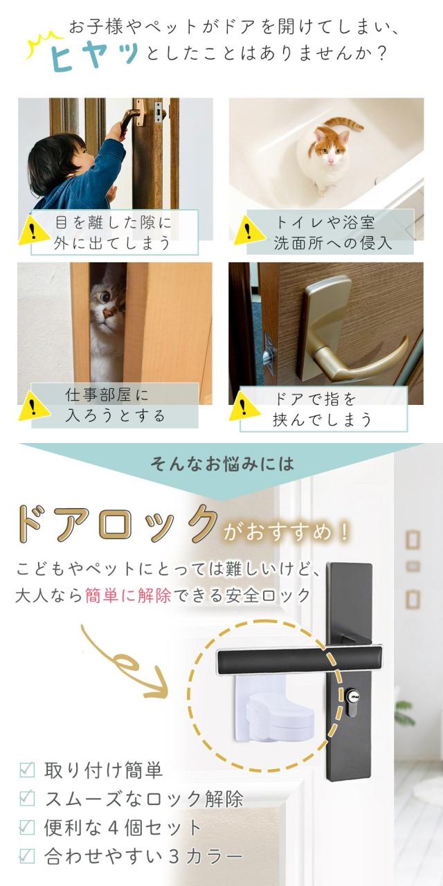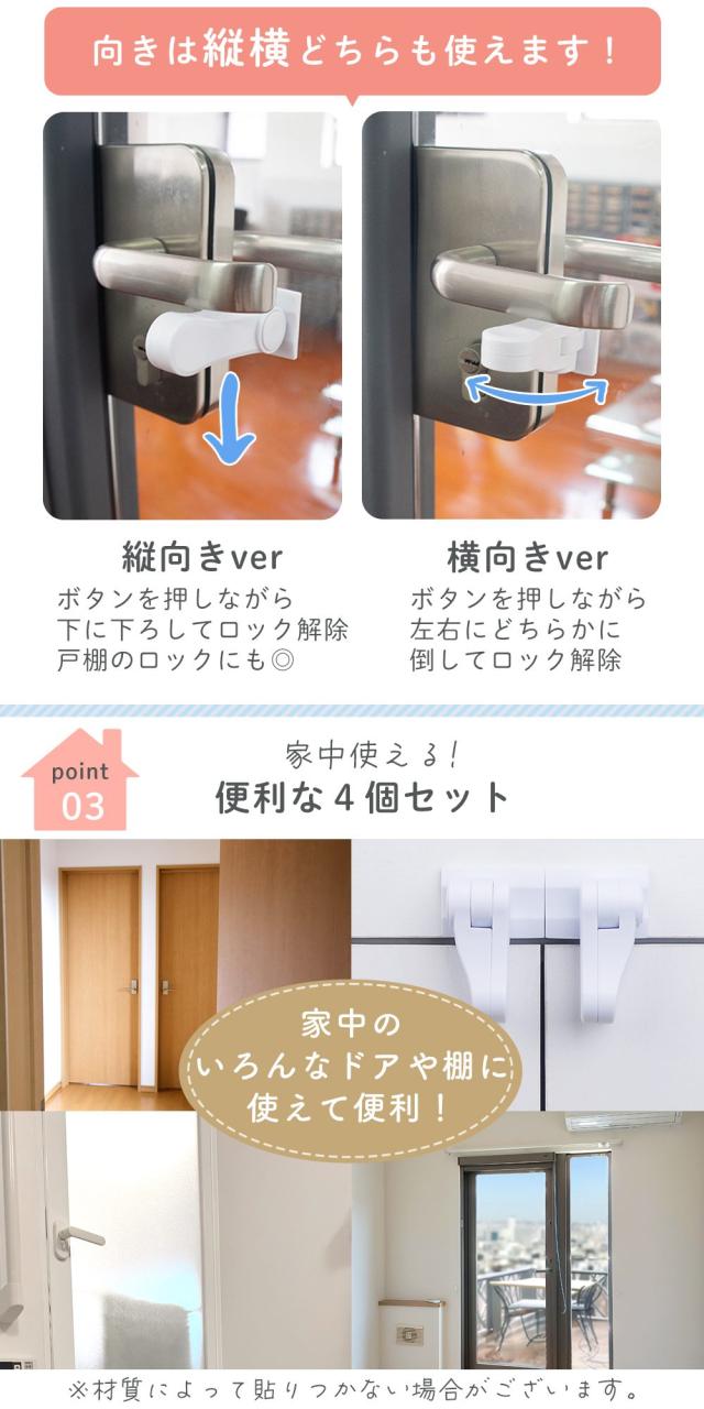 ドアロック 4個セット ドアノブロック ドアストッパー チャイルドロック 扉ロック 後付け 貼るだけ 取付簡単 工具不要 180度 ドアノブ ドアレバー 開閉防止 赤ちゃん 子供 ペット 猫 防犯 ドア開け防止 いたずら防止 安全対策 賃貸 玄関 リビング 縦向き 横向き mitas TN-DLDK