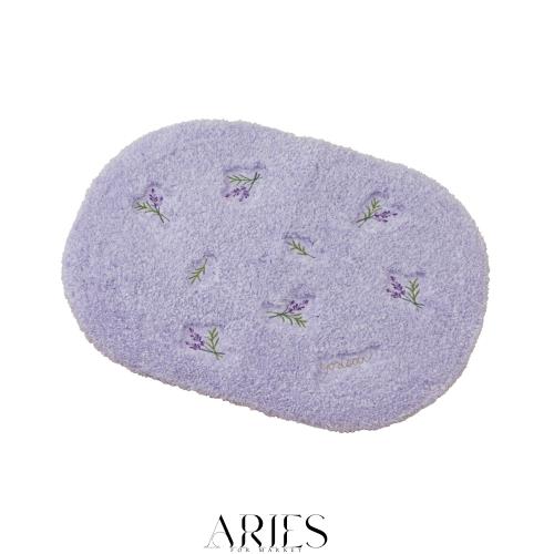 ポリエステル糸とポリエステルのスリット糸をミックスしたボリュームあるベースにラベンダーの花刺繍を散りばめました。柔らかなラベンダーカラーが大人可愛いラグです。バスルーム・玄関・洗面台など色々なところで使用いただけます。