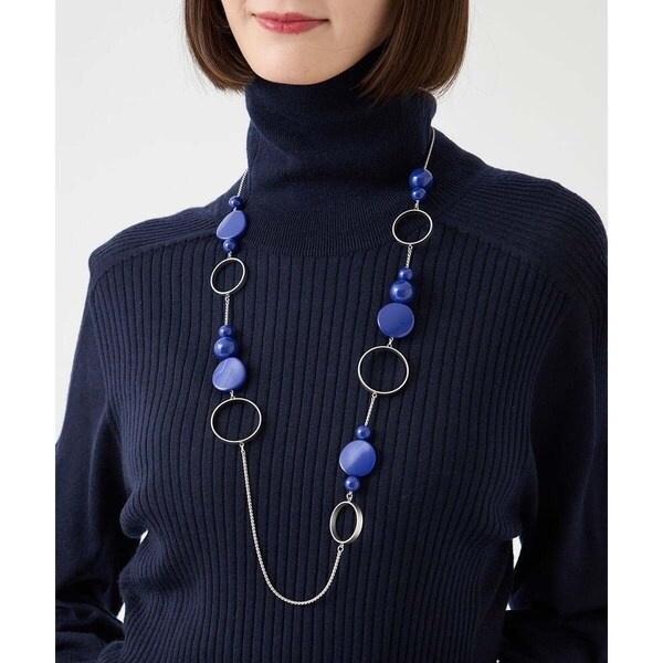メタルリングやサークルモチーフパーツがMIXされた華やかなデザインが特徴のネックレス。