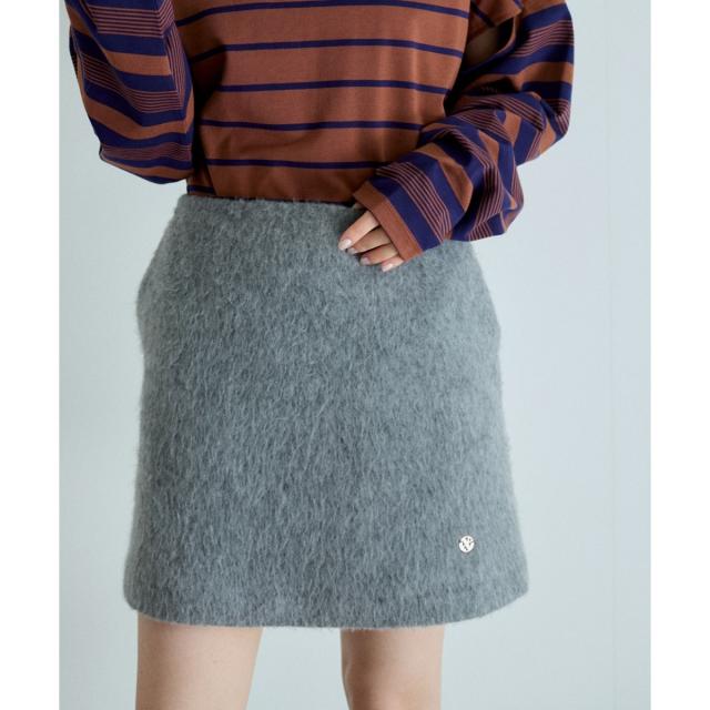 【オリジナルロゴのプレートがきらりと光るワンポイントに。長めの毛足のシャギー素材がシーズンムード高まるファーミニスカート】