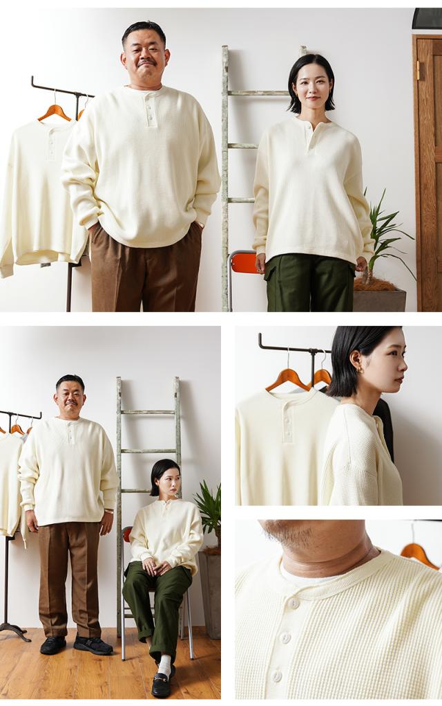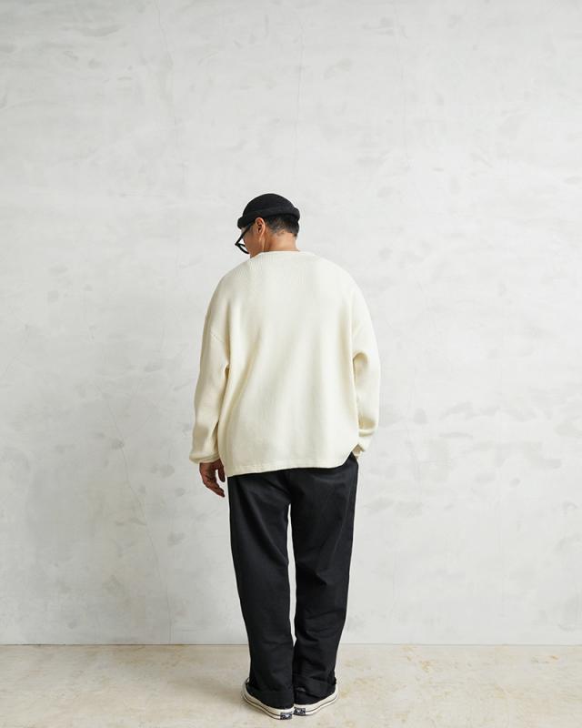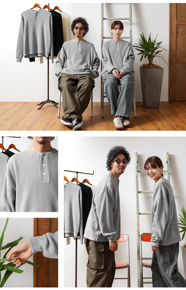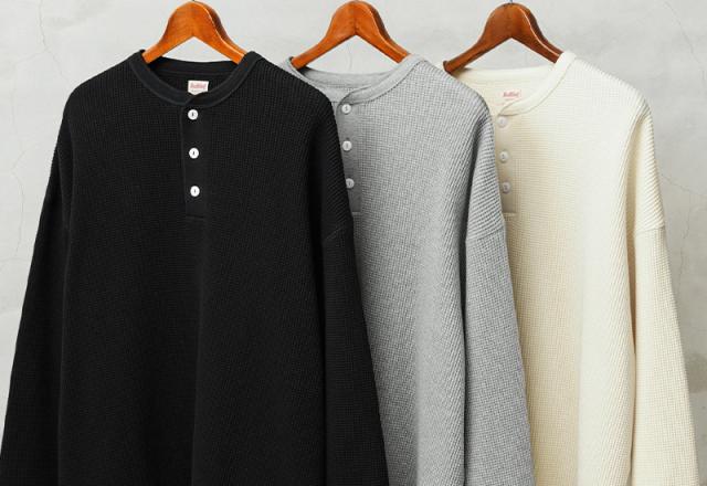 100年以上にわたる歴史の中でミリタリーとも密接に関わってきたHealthknitの技術と、WAIPERの独自性が融合したことで、従来のタイトフィットのサーマルとは一線を画すリラックスシルエットが実現しました。立体感のあるワッフル生地がまるでスウェットやニットのような存在感を放ち、これ一枚でも十分な着映えを楽しめます。