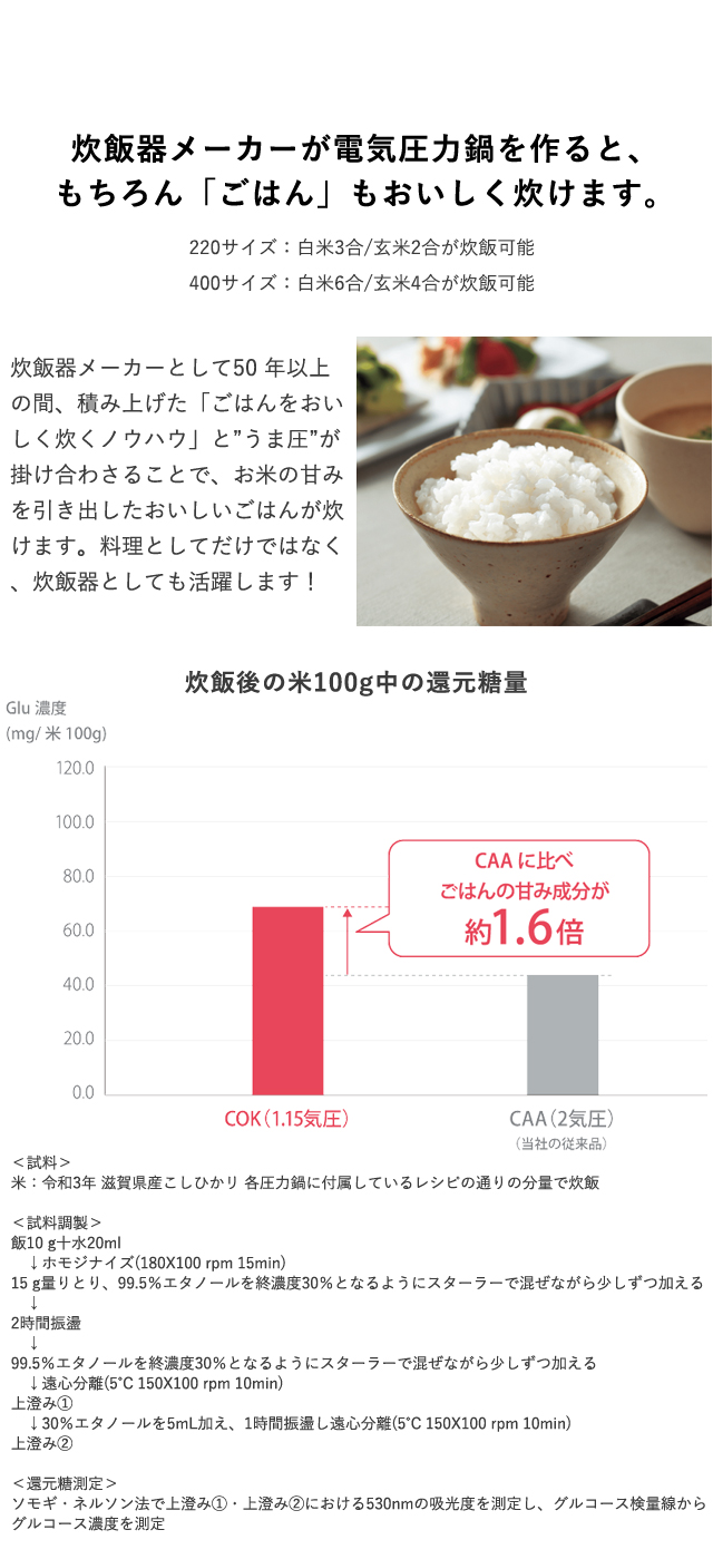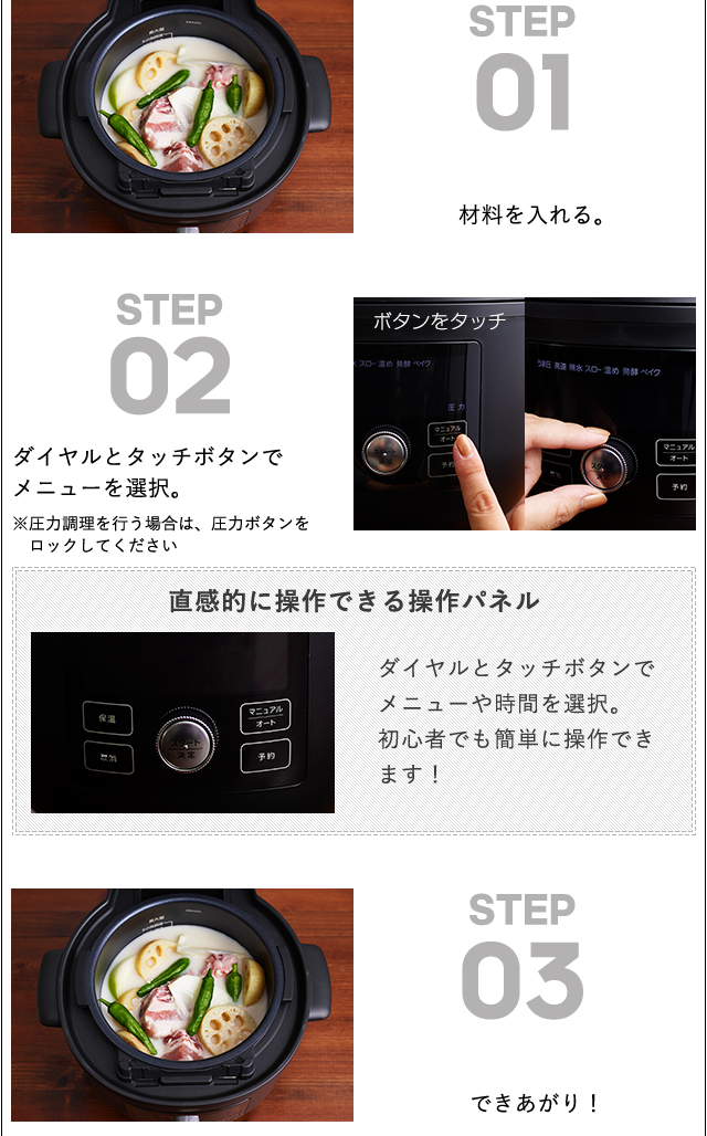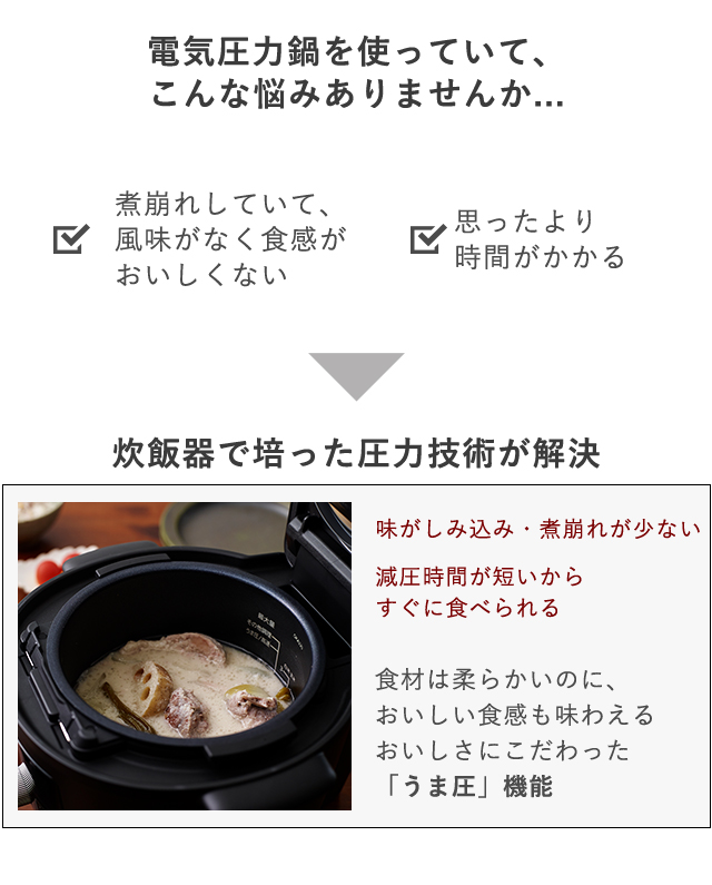 2)食材の食感を活かし、栄養素を逃しにくい。おいしさにこだわった「うま圧」調理。