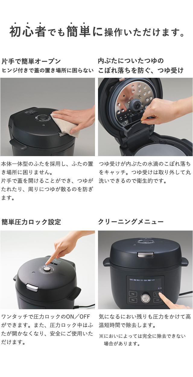 1)これ一台でごはんやおかず、発酵、スイーツもおまかせ!1台10役(うま圧、高速、スロー、低温、無水、発酵、ベイク、炊飯、茹で、温めコース)