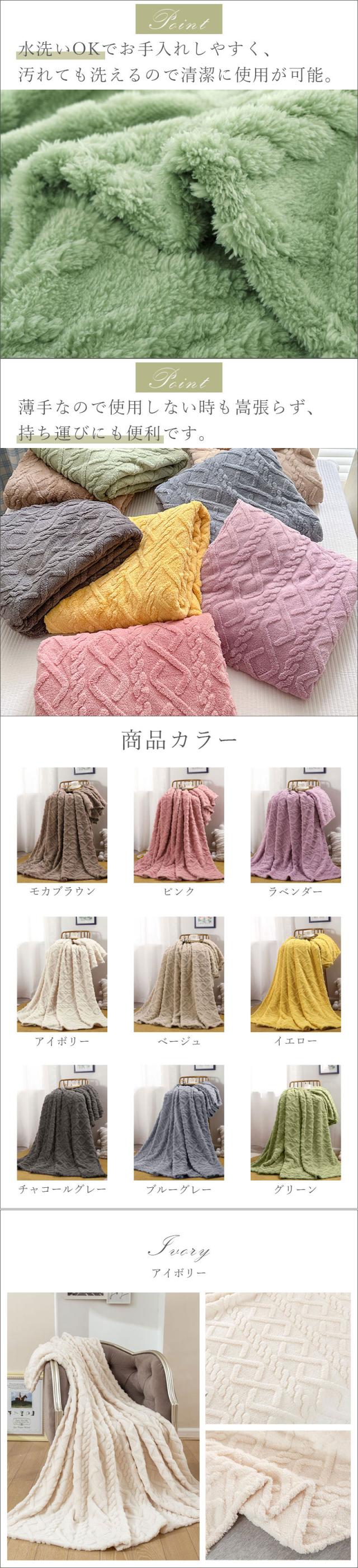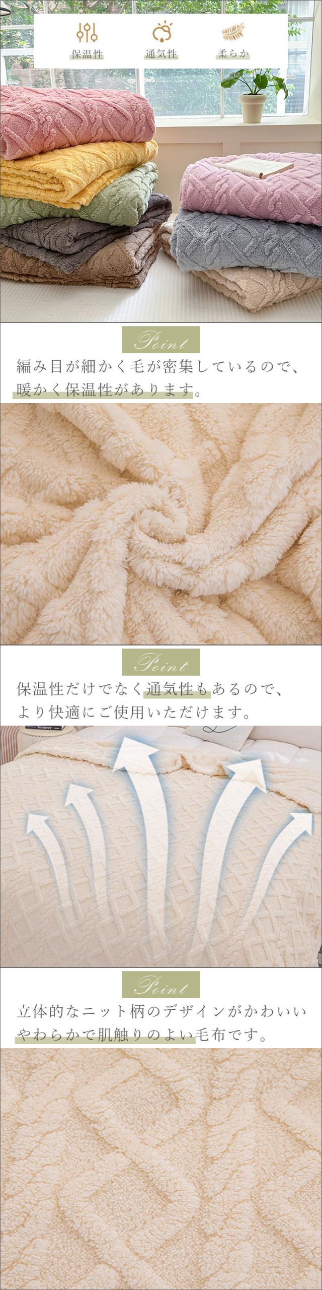 | 商品 特徴 | 【保温性】 編み目が細かく毛が密集しているので、暖かく保温性があります。 【通気性】 保温性だけでなく通気性もあるので、より快適にご使用いただけます。 【オシャレ】 立体的なニット柄にデザインがかわいい、やわらかで肌触りのよい毛布です。 【水洗いOK】 水洗いOKでお手入れしやすく、汚れても洗えるので清潔に使用が可能。 【薄手でコンパクト】 薄手なので使用しない時も嵩張らず、持ち運びにも便利です。 |