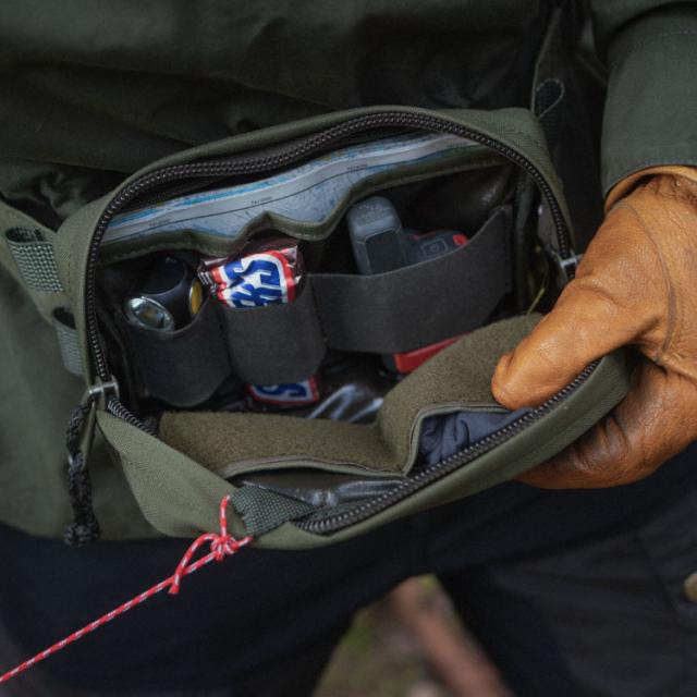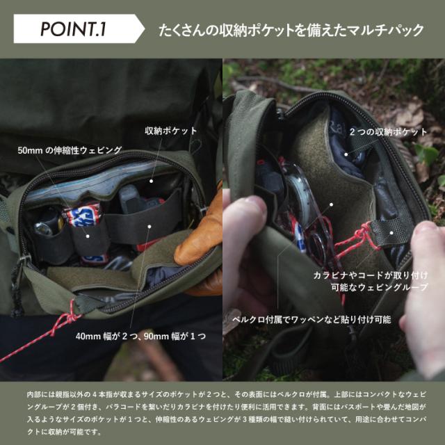 内部の手前側には親指以外の4本指が収まるサイズのポケットが2つと、その表面にはベルクロが付属。上部にはコンパクトなウェビングループが2個付き、パラコードを繋いだりカラビナやDカンを付けたり便利に活用できます。 内部の奥側にはパスポートや畳んだ地図が入るようなサイズのポケットが1つと、伸縮性のあるウェビングが3種類の幅で縫い付けられていて、用途に合わせてコンパクトに収納が可能です。 ※ベルクロ部にはパックの中で散らばるような細かいものがまとめられる「トリンケットポーチ フックバック 10×15cm(別売)」の装備がおすすめです。