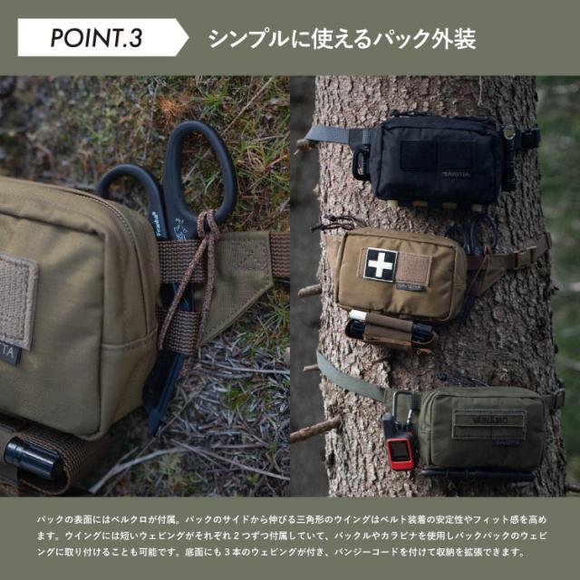 パックの表面には「ハッピーパッチ(別売)」がピッタリと貼れるサイズのベルクロが付属。 パックのサイドから伸びる三角形のウイングはベルト装着の安定性やフィット感を高めます。ウイングには短いウェビングがそれぞれ2つずつ付属していて、バックルやカラビナを使用しバックパックのウェビングに取り付けることも可能です。底面にも3本のウェビングが付き、「マルチツールポーチ(別売)」をセッティングできるほか、バンジーコードを付けて収納を拡張できます。 パック裏面のオープンコンパートメントは両サイドからアクセスでき、内部にベルトを収納することが可能です。