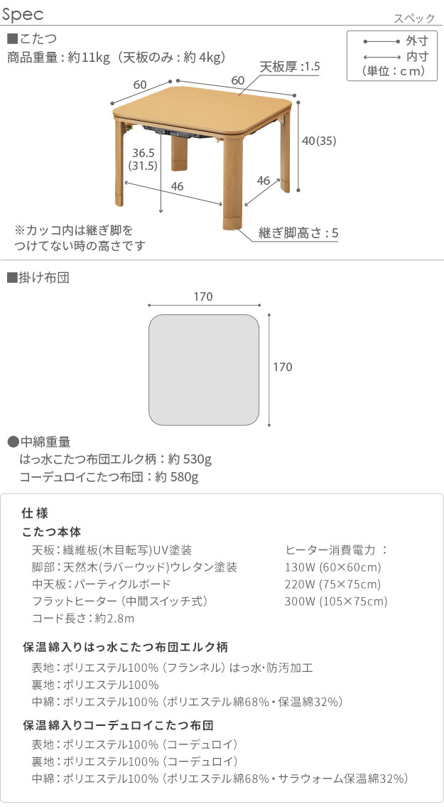 60×60cm 2点セット(こたつ本体+こたつ布団) | 75×75cm 2点セット(こたつ本体+こたつ布団) | 105×75cm 2点セット(こたつ本体+こたつ布団) |