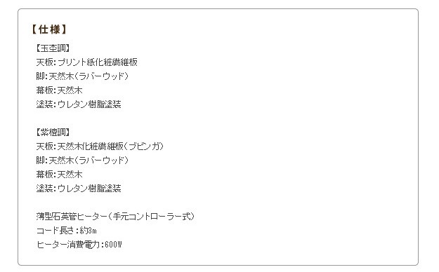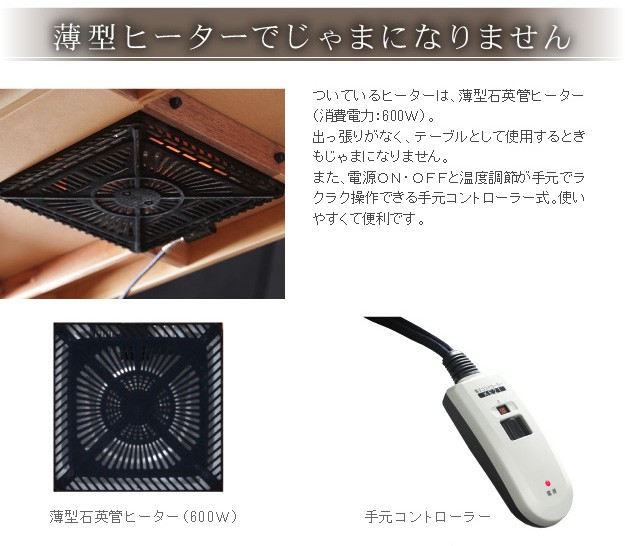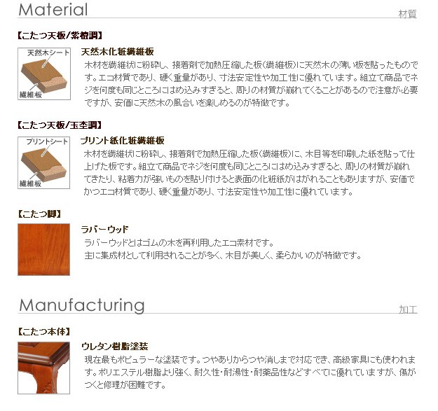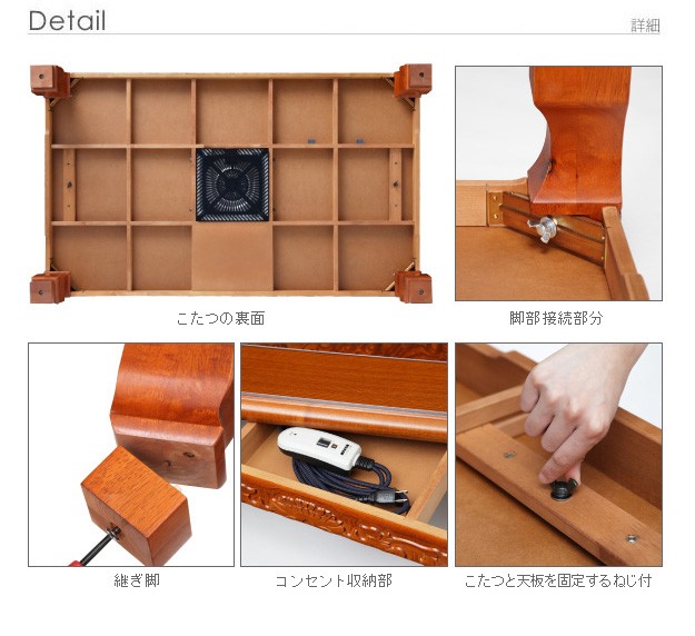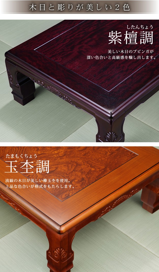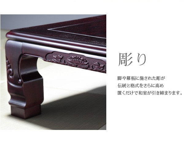 商品について:ボリュームのある脚と幕板に彫りを施した日本製の和調こたつ。美しい木目と上品な色合いは高級感があります。継ぎ脚がついているので、座布団・座椅子など使うものに合わせて高さ調節していただけます。