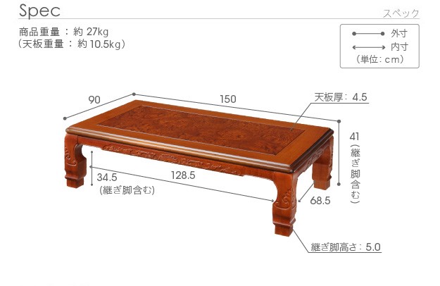 サイズ(cm):幅150x奥行90x高さ41cm(36cm+継脚5cm)・約27kg