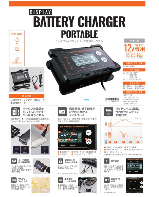 ★送料無料★デイトナ(Daytona) バイク用 バッテリー充電器 12V専用 ポータブル電源対応 ディスプレイ付き バッテリーチャージャー 37802