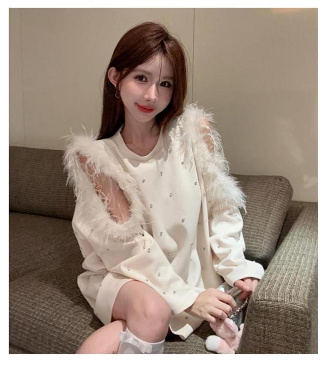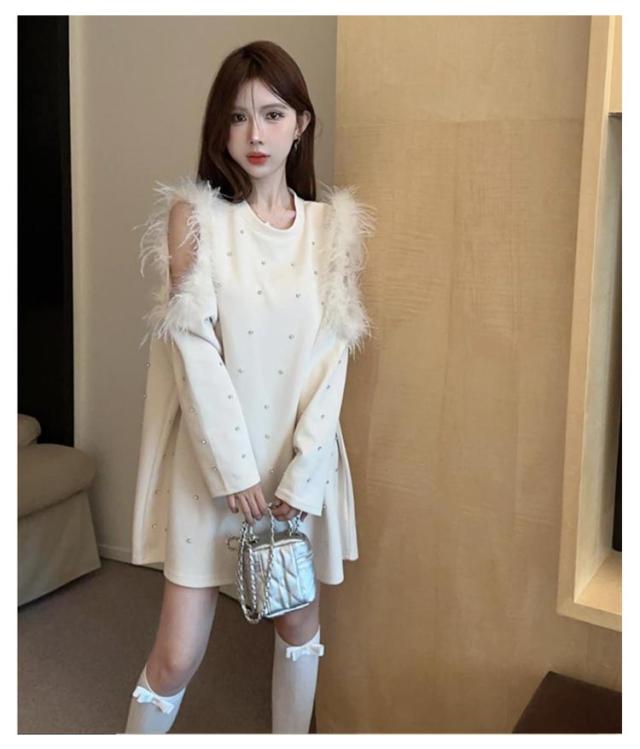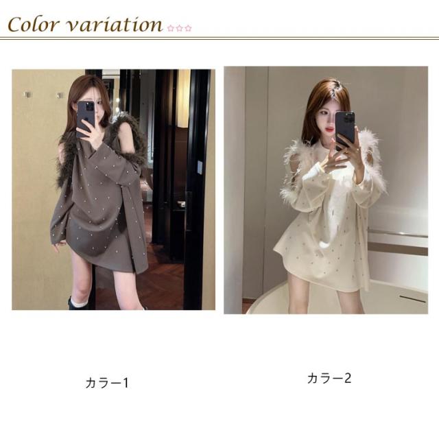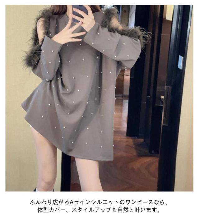 オフショルダー チュニック 秋 ワンピース 肩開き 肩あき チュニックワンピース ミニ ジュエリー もこもこ 長袖 秋冬 セクシー オープンショルダー 肩だし ジュエリー 韓国ファッション S M L XL 2XL