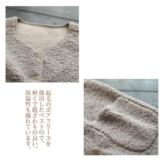 | 単品でも、インナーでも、ライナーでも秋から春までロングシーズンに大活躍間違いなしのベストです。 秋冬に着回ししやすいなカラーで揃えました。 起毛のボアフリースを採用したベストので、軽くで肌ざわりの良い、保温性も優れています。 ブラウスやワンピースの上に羽織ったり。 防寒対策にアウターの下に1枚着るだけでぽかぽか 体にフィット感がありながら動きやすく、サラッとした着心地です。 | |