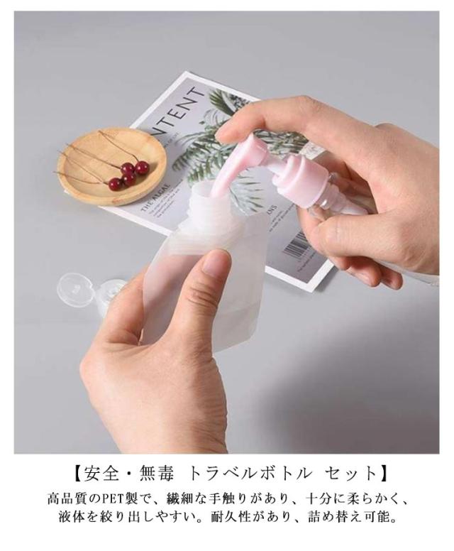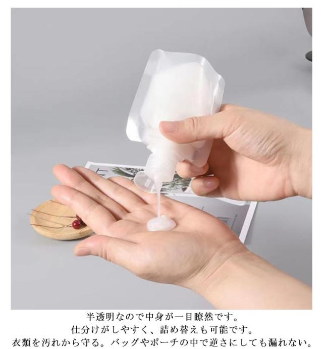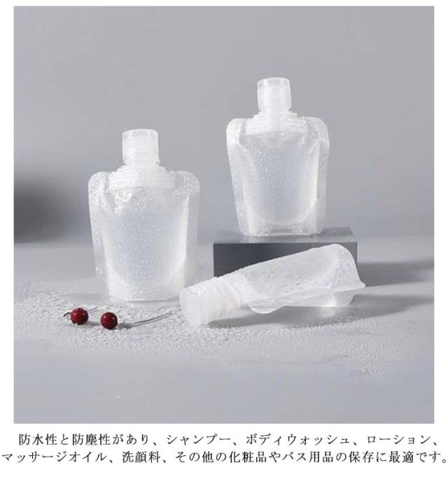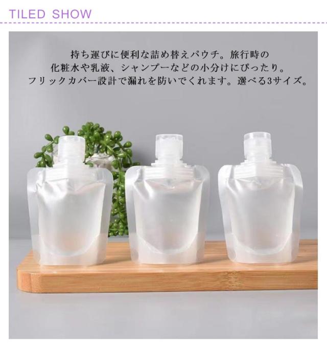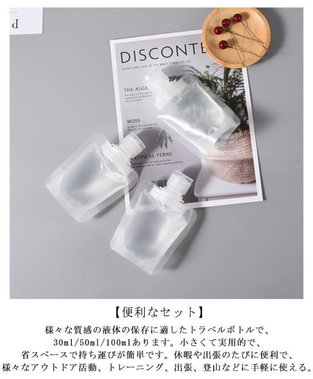 | トラベル液体個包装 旅行ボトル。持ち運びに便利な詰め替えパウチ。旅行時の化粧水や乳液、シャンプーなどの小分けにぴったり。フリックカバー設計で漏れを防いでくれます。選べる3サイズ。 【便利なセット】様々な質感の液体の保存に適したトラベルボトルで、30ml/50ml/100mlあります。小さくて実用的で、省スペースで持ち運びが簡単です。 休暇や出張のたびに便利で、様々なアウトドア活動、トレーニング、出張、登山などに手軽に使える。 【安全・無毒 トラベルボトル セット】高品質のPE製で、繊細な手触りがあり、十分に柔らかく、液体を絞り出しやすい。耐久性があり、詰め替え可能。 防水性と防塵性があり、シャンプー、ボディウォッシュ、ローション、マッサージオイル、洗顔料、その他の化粧品やバス用品の保存に最適です。 【透明デザイン・液漏れ防止】半透明なので中身が一目瞭然です。仕分けがしやすく、詰め替えも可能です。優れた構造材を使用し、フリックカバー設計で、液漏れを防止します。衣類を汚れから守る。バッグやポーチの中で逆さにしても漏れない。 普段使いから、旅行、アウトドアまで幅広くお使いいただける便利なアイテムです。 | |