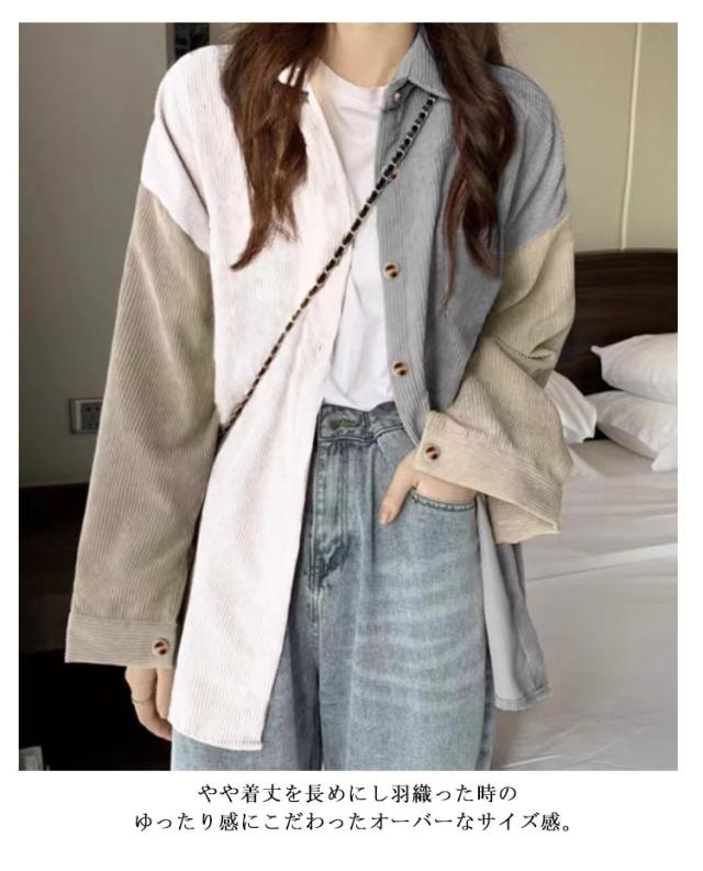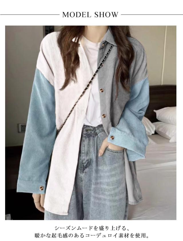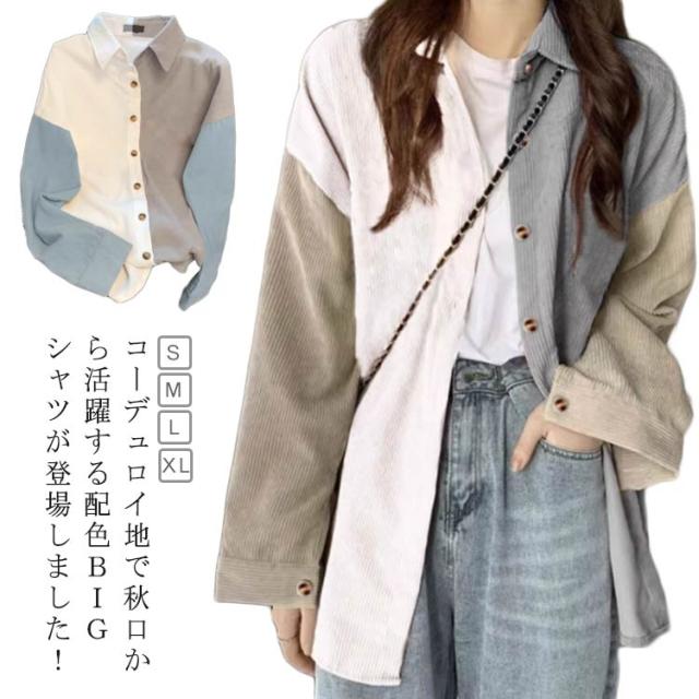 コーデュロイシャツ シャツ ネルシャツ トップス パッチワーク レディース 秋物 配色 長袖 長袖シャツ チュニック丈 秋服 厚手 あったか 起毛 コーデュロイ ロングシャツ ブラウス 羽織り ゆったり コーデュロイ 秋 無地 体型カバー 着?せ 大人 カジュアル おしゃれ