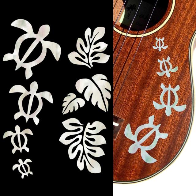Jockomo Honu/ホヌ・ファミリー & ハワイアン Leaf(ホワイトパール)ウクレレにピッタリ インレイステッカー