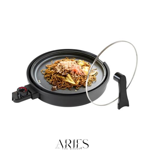 ●家族や友人と食卓を囲んで楽しめる丸型ホットプレート。 ●お好み焼きや餃子、やきそばなどの定番料理からホットケーキなどのおやつ作りまで様々な料理が楽しめる。 ●ふたは取っ手がスタンドとなり自立するのでキッチンで調理する際や卓上で使用する際にも置き場所に困らない。 ●中身が見えるガラス蓋がついているので、出来上がりがすぐに分かる。 ●メニューに合わせて保温(約80℃)~強(約230℃)まで設定できる温度調節機能搭載。 ●操作方法はダイヤルを回すだけのシンプル操作なので、どんな年代の方にも簡単に操作できる。 ●汚れがこびりつきにくいフッ素コート加工仕様のプレート。 ●プレートは着脱式で本体ガードは丸洗い可能なのでお手入れもラクラク。