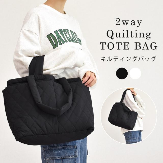 秋新作 キルティング トートバッグ ハンドバッグ 2way バッグハンドル 大容量 レディース 鞄 かばん カバン 肩掛け ダイヤキルト アウトポケット A4サイズ 収納 マチ付き 軽量 約160g 旅行 プレゼント 誕生日 黒 白