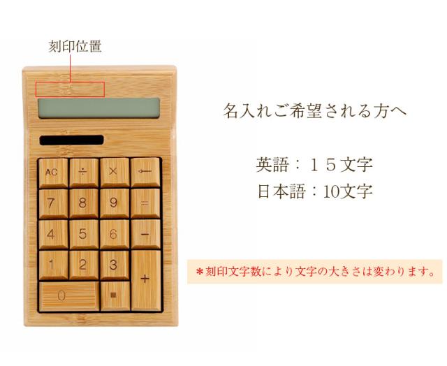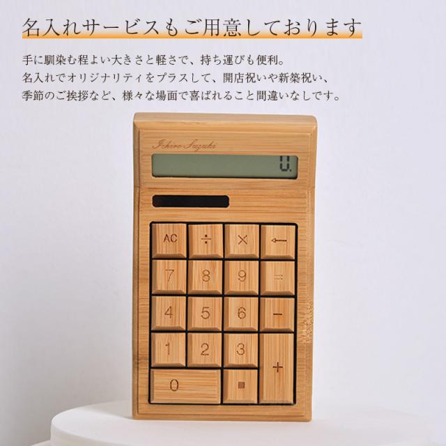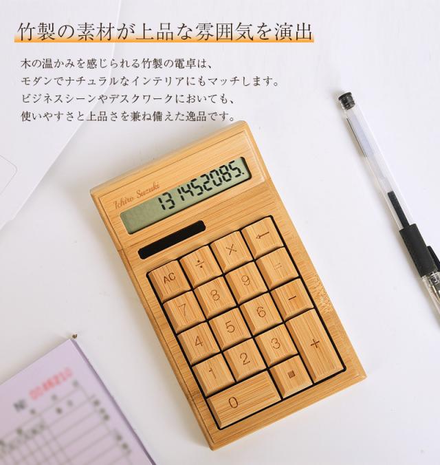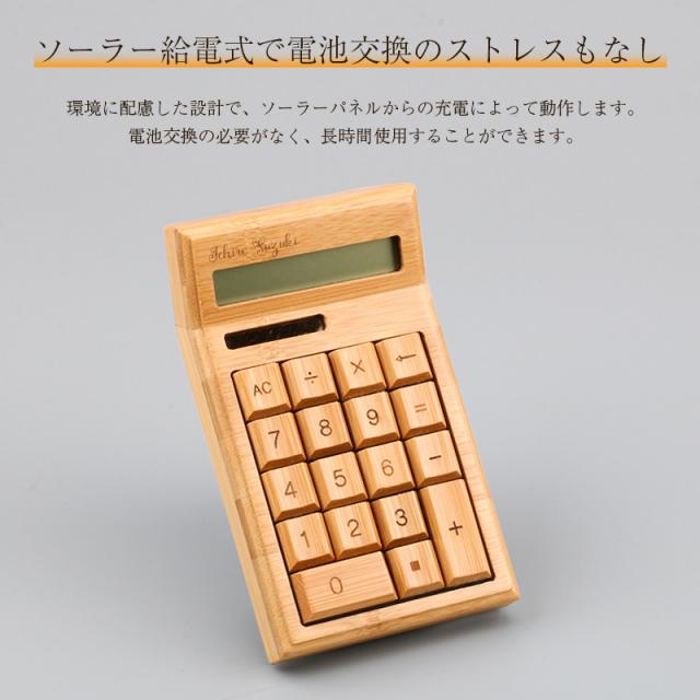 おしゃれなデザインと使いやすさを兼ね備えた電卓は、毎日の業務や計算を快適にサポートします。 竹製の素材感は、ナチュラルな雰囲気を演出してくれます。名入れオプションで、特別なプレゼントとしても最適です。