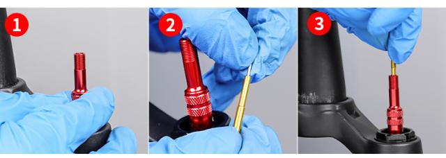 1.フロントフォークエアバルブをねじ込みます。 指ぬきを調整します。 指ぬきに入れる