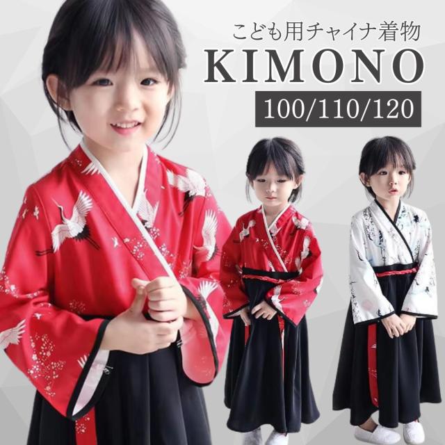 【在庫限り】子供用 鶴の着物 チャイナ着物 中国着物 漢服 コスプレ 上下セット 100 110 120 全2色 レッド ホワイト 筒袖 鶴 鶴柄 セットアップ 巻きスカート ラップスカート キッズ 女の子 男の子 パーティードレス キッズドレス チャイナ服