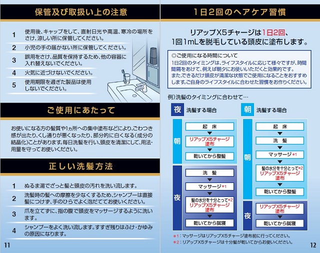 ●毛髪が成長するには時間がかかります。リアップX5チャージの効果がわかるようになるまで、少なくとも4ヵ月間、1日2回、毎日続けてご使用ください。