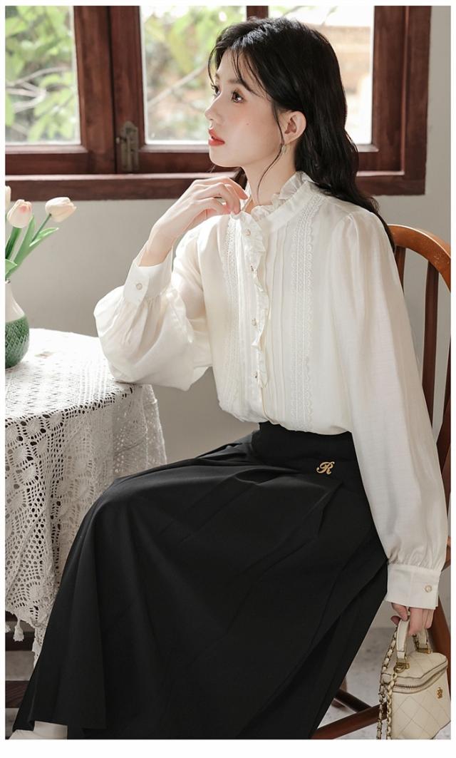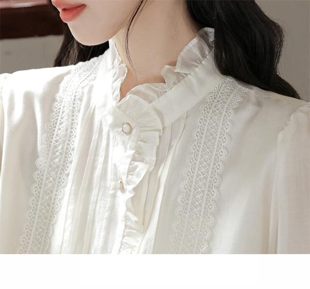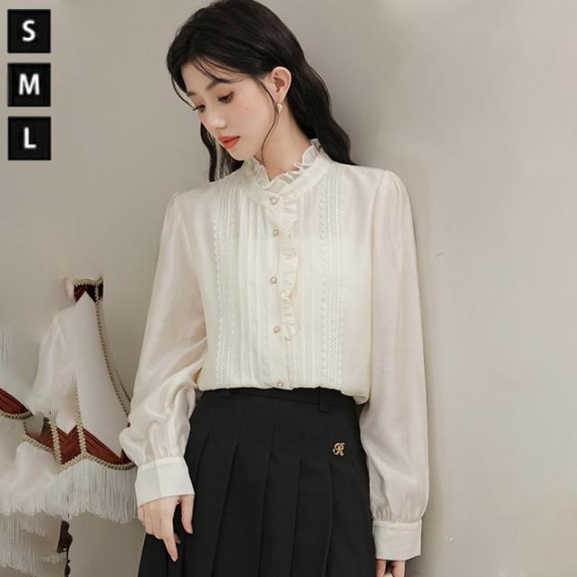 スタンドカラーブラウス 立ち襟 フリルハイネック レース ロングブラウス 長袖 襟付 シャツ オフィス きれいめ かわいい 上品 春 秋 xz117d7cyxq