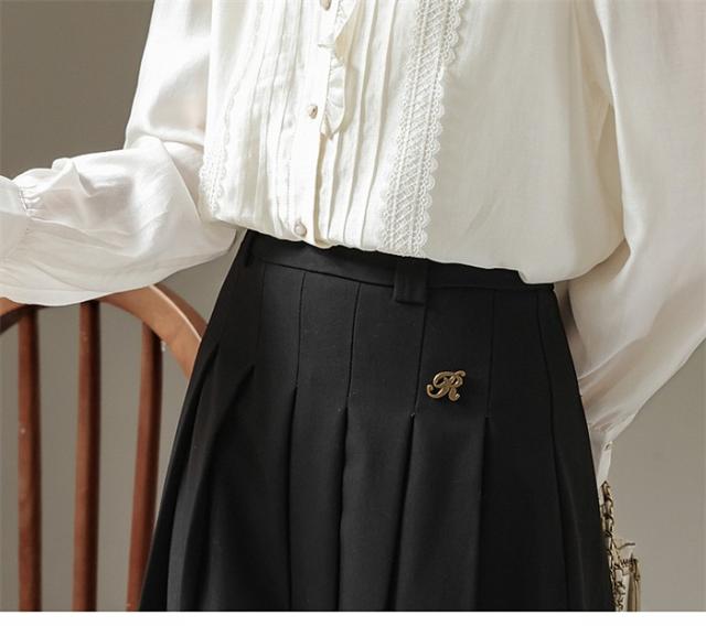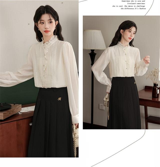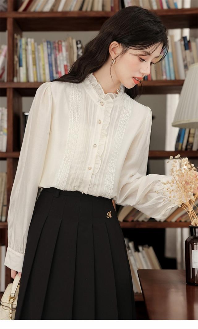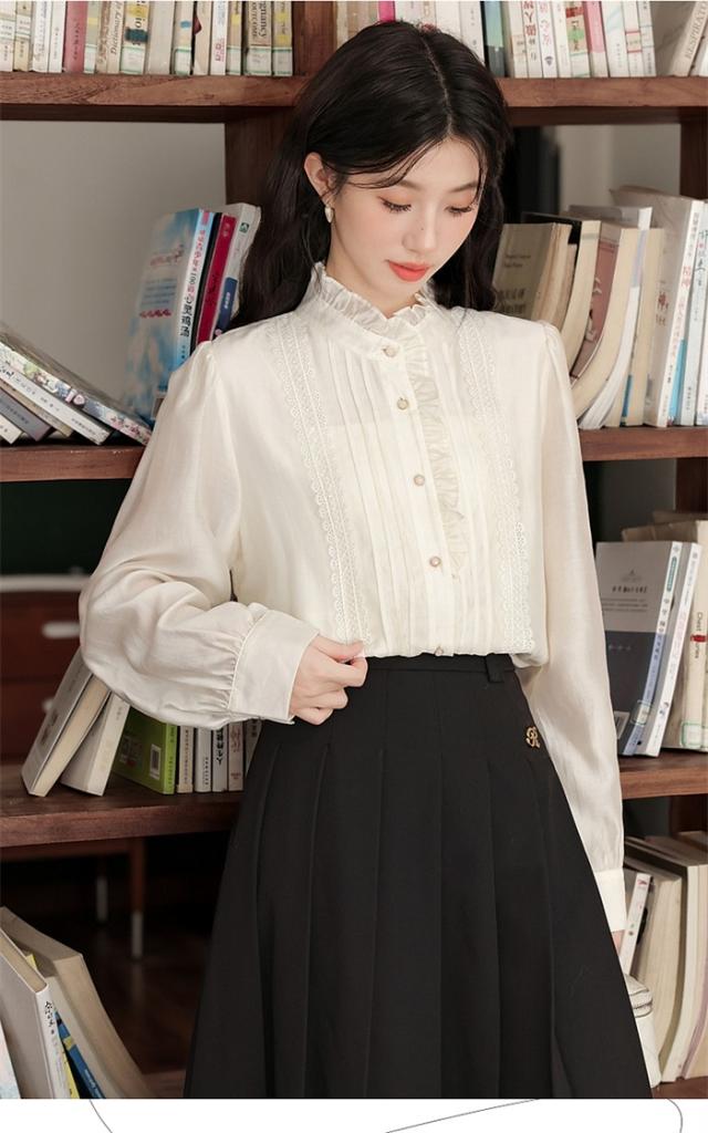 スタンドカラーブラウス 立ち襟 フリルハイネック レース ロングブラウス 長袖 襟付 シャツ オフィス きれいめ かわいい 上品 春 秋
