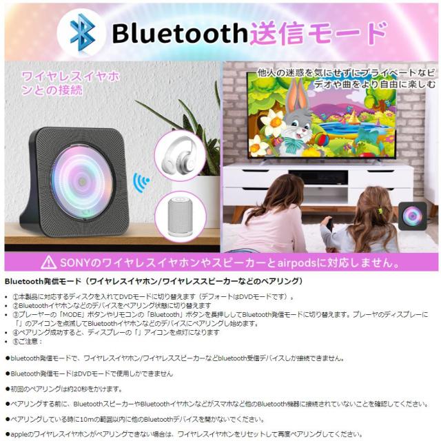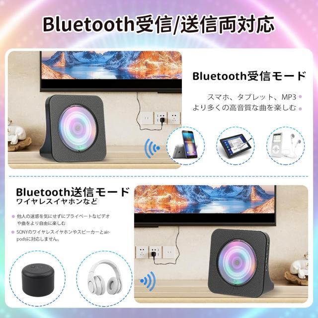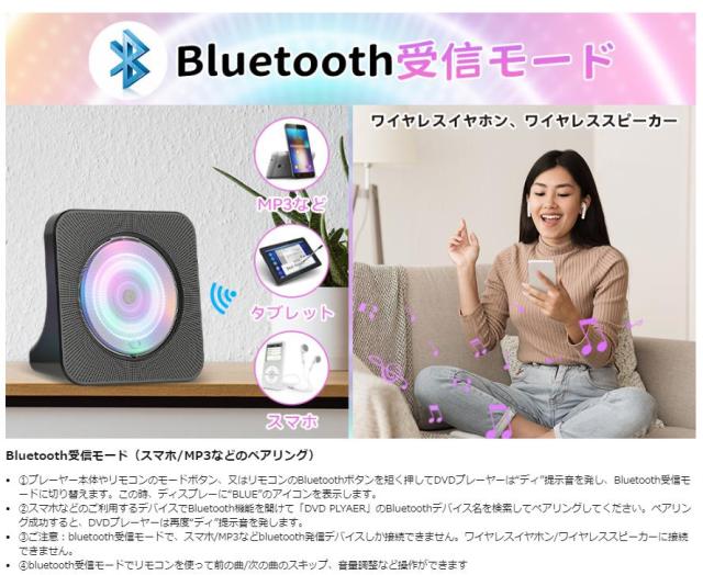 従来のDVDプレーヤーと比べて、本製品はBluetooth受信とBluetooth送信の両方の機能に対応し、スマホ、タブレットなどのデバイスだけではなく、Bluetoothイヤホンなども接続が可能で、他人の迷惑を気にすることせずにプライベートなビデオや曲をより自由に楽しむことができます。