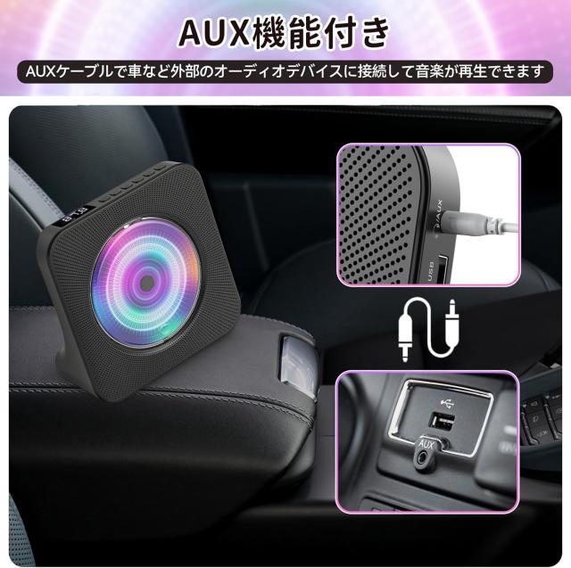 また、AUX機能も搭載しており、AUXケーブルで車など外部のオーディオデバイスに接続して音楽が再生できます。