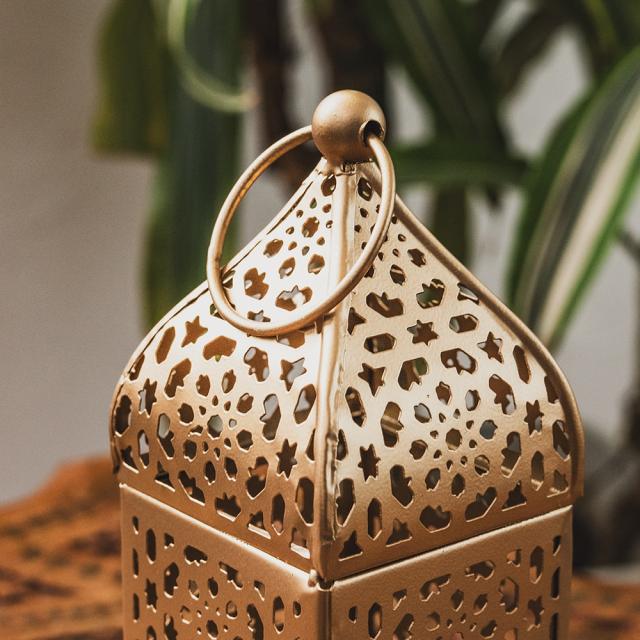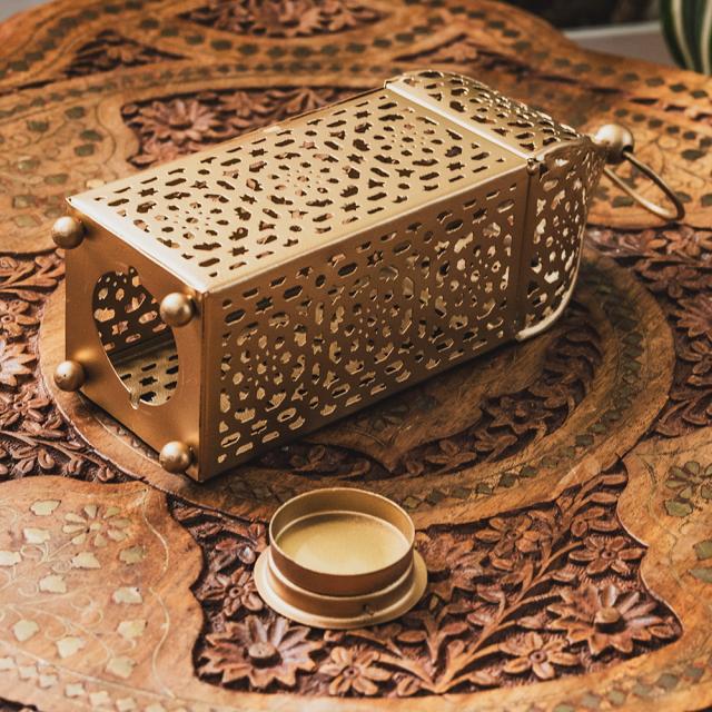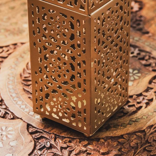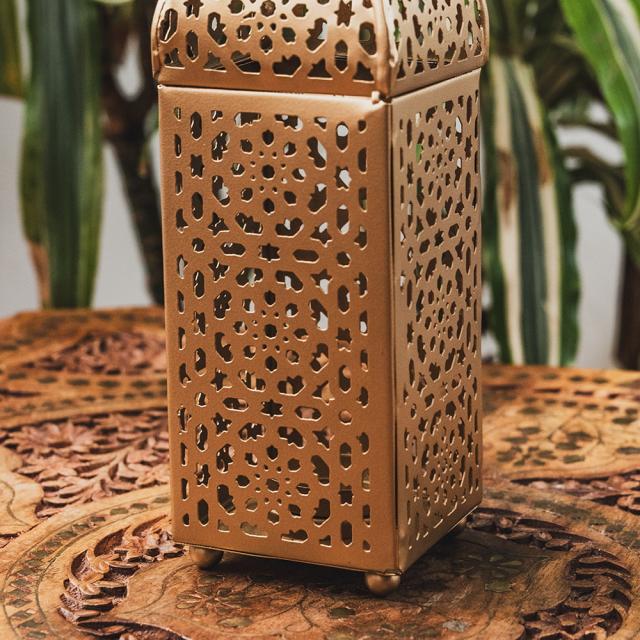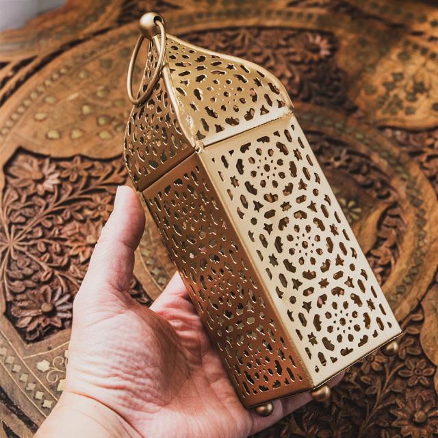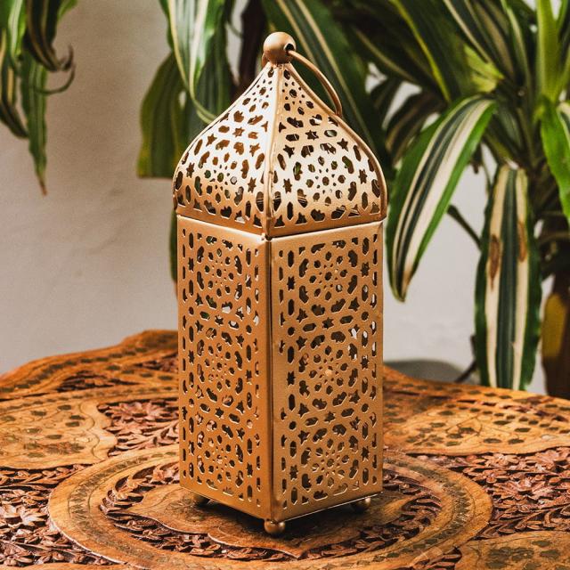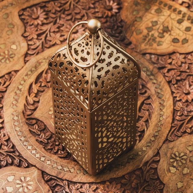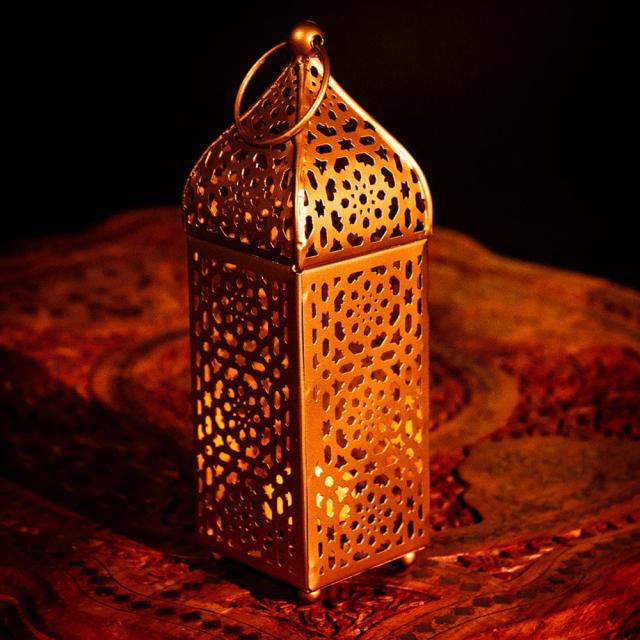 LEDのキャンドルライト、ティーキャンドルなどを中に入れる為のモロッコ風ランタンです。底の部分または横の部分に開口部があり、そちらからライトを出し入れできるように作られています。装飾の入った色とりどりのガラスが周りに付いていて、ガラス越しに見えるキャンドルライトの明かりはとても綺麗。上部に開いている穴からも明かりがこぼれ、壁に投影される影を見ていると癒やされます。使っていない普段もガラスが綺麗でインテリアとして映えて素敵です。