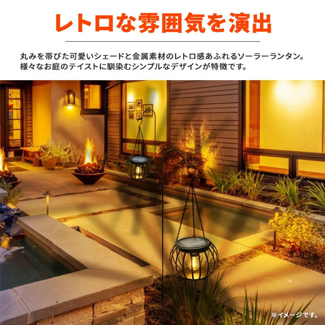丸みを帯びた可愛いシェードと金属素材のレトロ感あふれるソーラーランタン。様々なお庭のテイストに馴染むシンプルなデザインが特長です。