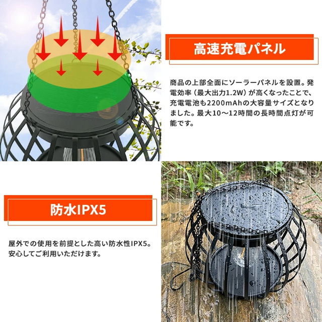 電気代を気にしなくていいソーラー充電式。商品の上部に発電効率が高い(最大出力1.2W)黒色ソーラーパネルを設置。2200mAhの大容量バッテリーで長時間点灯(約10〜12時間)。